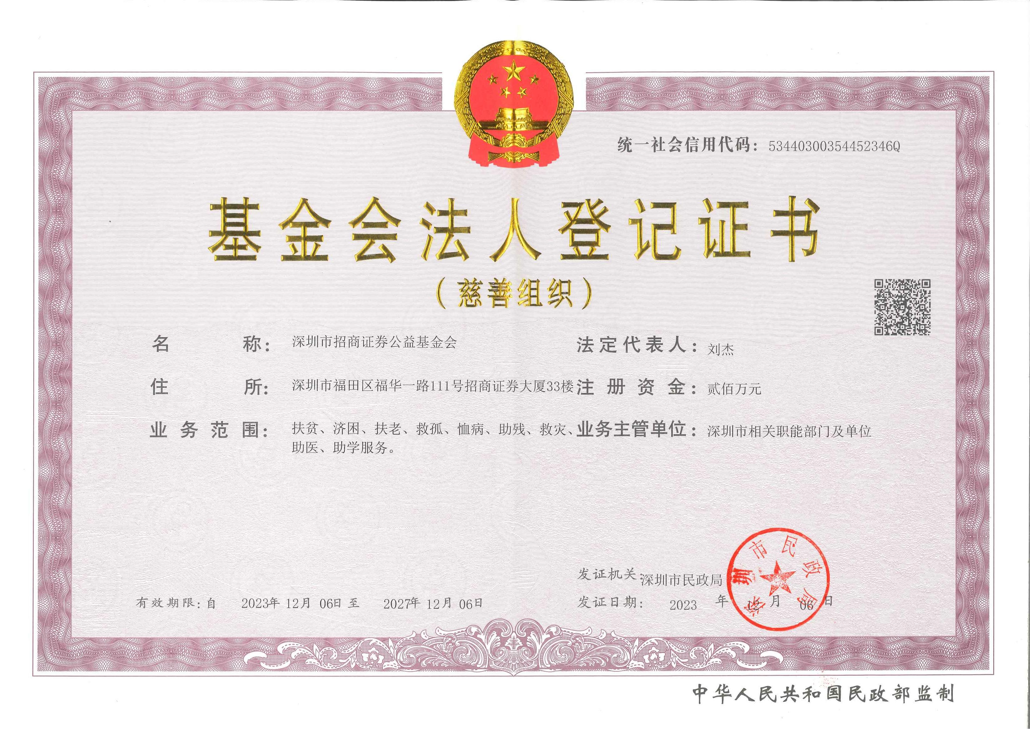 深圳市招商证券公益基金会获深圳市民政局正式批复(深民函[2015]1622号),准予设立登记(基证字第01055号)。