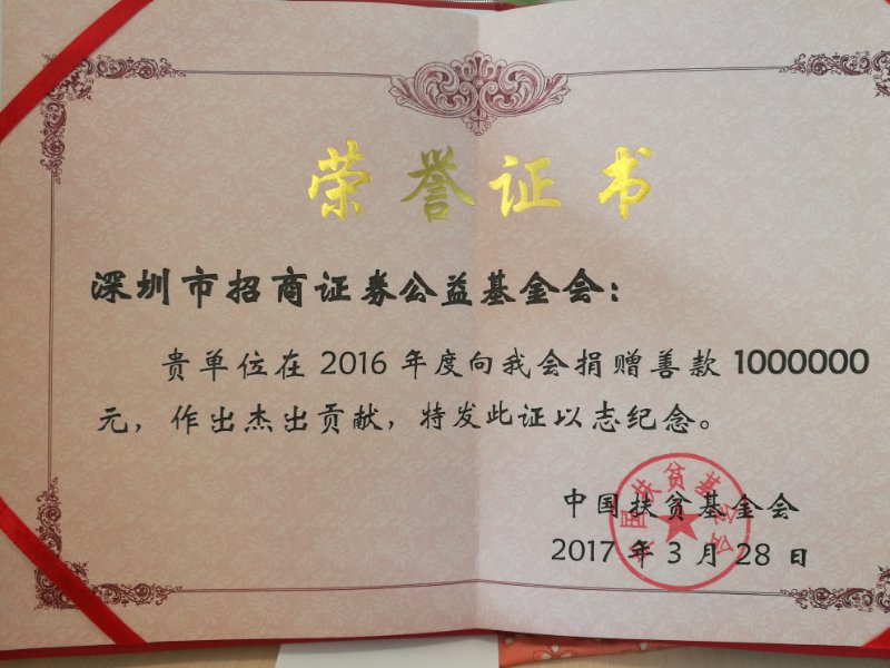 2017年3月28日,主题为"精准扶贫,稳健发展"的中国扶贫基金会2016年度捐赠人大会在京举行。招商证券公益基金会因在2016年度扶贫工作中做出杰出贡献,被中国扶贫基金会授予"2016年度扶贫大使奖"。